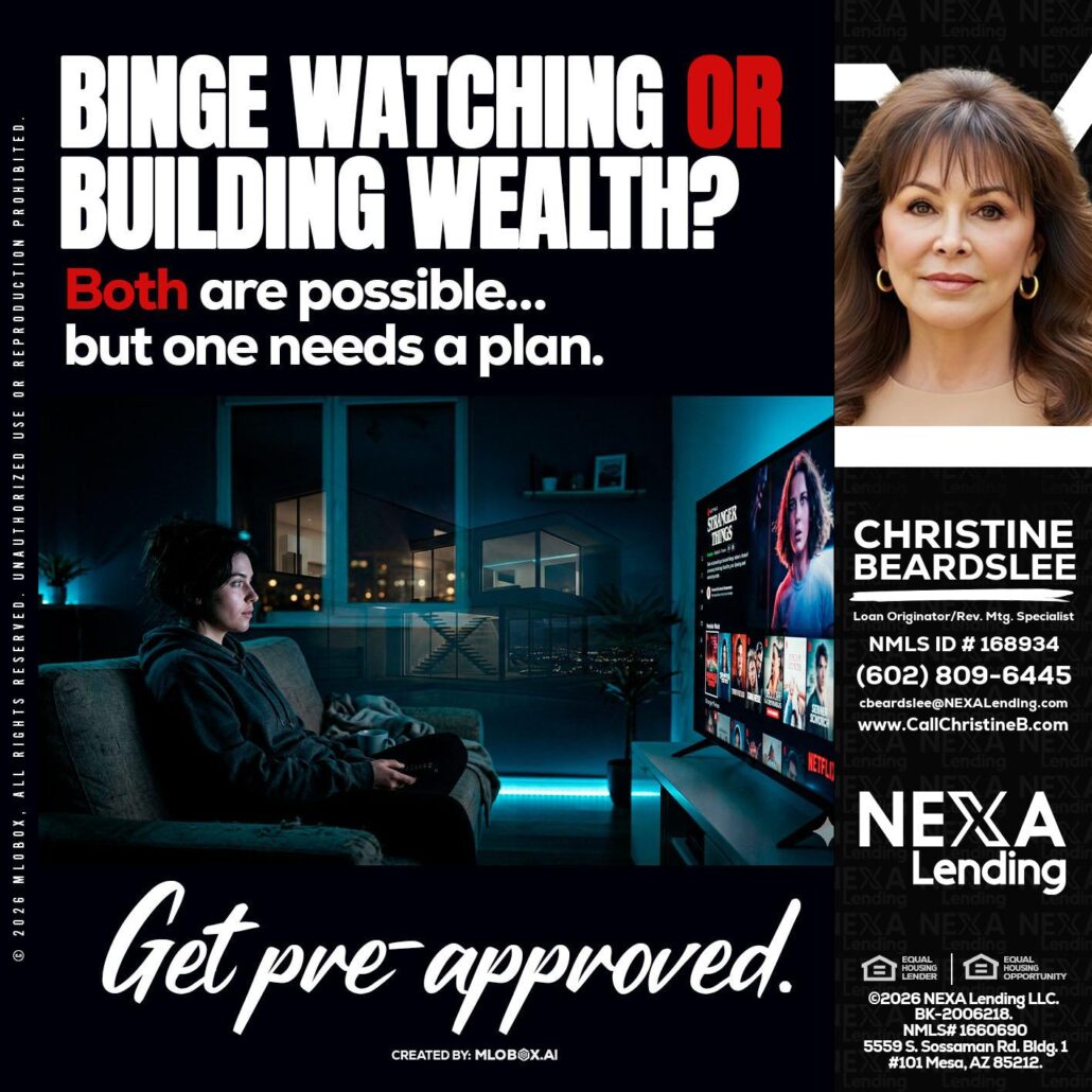 BINGE WATCHING - Christine Beardslee -MLO/Executive Partner/National Recruiter/Faster/Easier/Better RatesHi, my name is Christine Beardslee. I’m a Loan Officer with NEXA Lending LLC., offering personalized mortgage solutions, fast customized quotes, great rates and service with integrity.