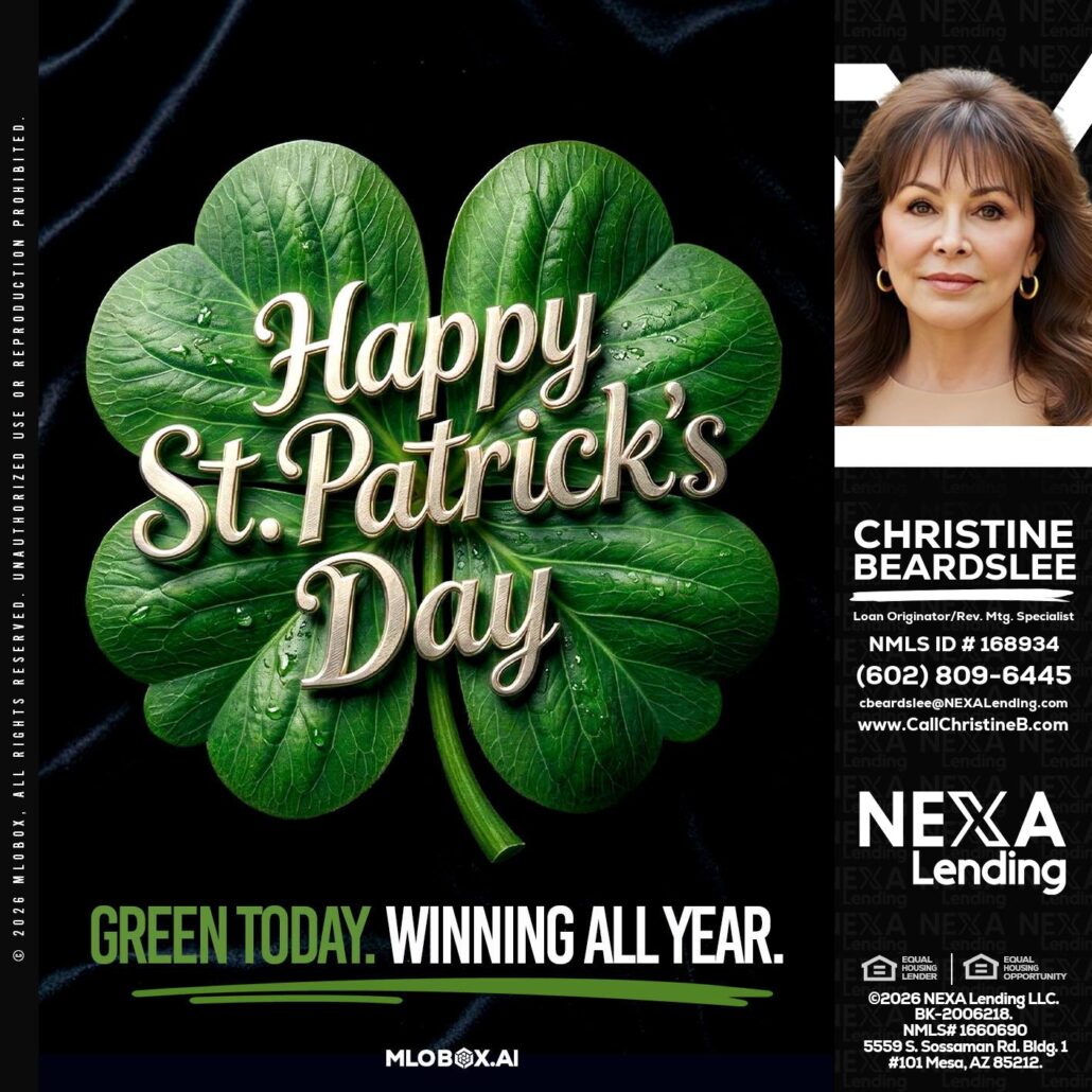 happy st. Patricks day - Christine Beardslee -MLO/Executive Partner/National Recruiter/Faster/Easier/Better RatesHi, my name is Christine Beardslee. I’m a Loan Officer with NEXA Lending LLC., offering personalized mortgage solutions, fast customized quotes, great rates and service with integrity.