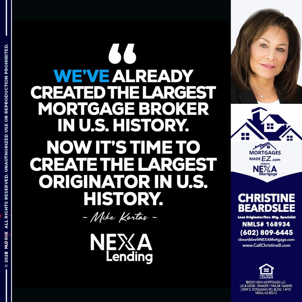 MIKE KORTAS - Christine Beardslee -MLO/Executive Partner/National Recruiter/Faster/Easier/Better RatesHi, my name is Christine Beardslee. I’m a Loan Officer with NEXA Mortgage LLC., offering personalized mortgage solutions, fast customized quotes, great rates and service with integrity.